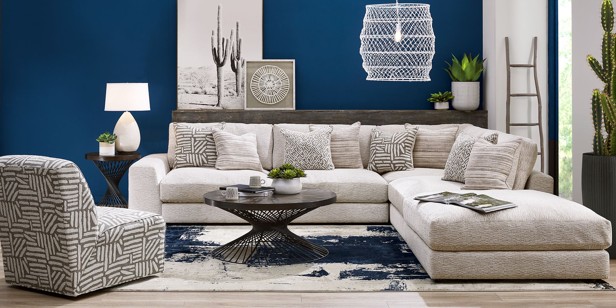 A striking grey and navy blue living room particularly lends itself to leather and metallic accessories and occasional pieces.
